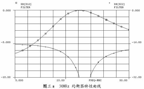 图二a是30MHz/6dB插片式固定均衡器电原理图,它采用了桥“T”型电路,调整L1、L2可使30MHz谐振点损耗低于0.4dB,均衡误差优于±0.5dB。